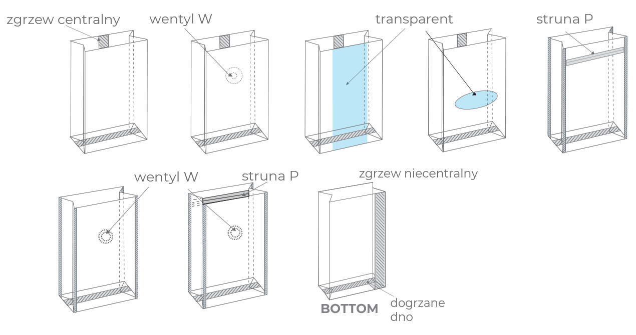 Torebki stojące z prostokątnym dogrzanym dnem i zgrzewem tylnym, niecentralnym. Specjalna budowa stabilnego dna umożliwia wygodne zapakowanie i ekspozycję wypełnionej torebki w pionie, nawet lekkich produktów. W ofercie w sprzedaży on-line opakowania Bottom OPP z polipropylenu, matowe opakowania Bottom OPP MAT, opakowania Bottom metalizawane.